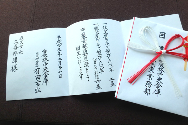 平成29年2月27日に、農林中央金庫と埼玉県森林組合連合会、秩父広域森林組合の共同により、秩父産ヒノキを利用した木製ベンチを秩父市へご寄贈いただきました。 これは、農林中央金庫の森林・林業分野におけるCSR活動(社会貢献活動)の一環として、今回秩父市にご寄贈いただいたものです。