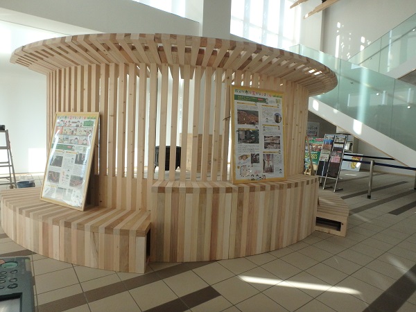 平成29年3月24日、秩父広域森林組合様から、スギ・ヒノキ・ケヤキ・カエデ・クリの5種類の秩父産木材で作られた特製家具「木のお休み処”笠ほこ”」を市へご寄贈いただきました。